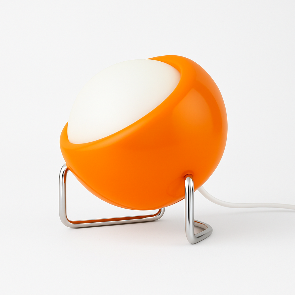 Egg-shaped beige/orange glass shade paired with a brushed steel base—retro meets refined.